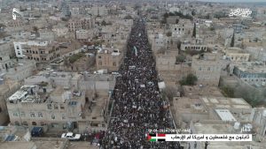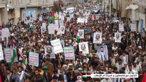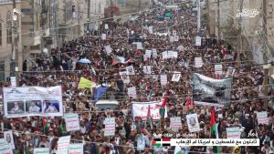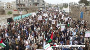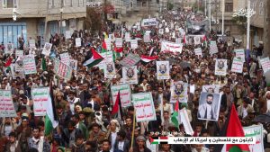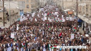خرج أبناء محافظة ذمار اليوم في مسيرة جماهيرية حاشدة تأكيداً على استمرار التضامن مع الشعب الفلسطيني وإستنكاراً بالعدوان الأمريكي والبريطاني على اليمن، تحت شعار “ثابتون مع فلسطين وأمريكا ام الإرهاب”.