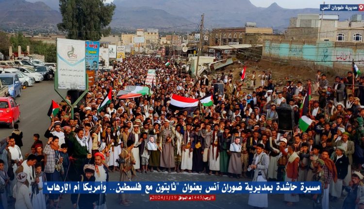 خرج أبناء مديرية ضوران آنس عصر اليوم بصورة غير مسبوقة في مسيرة “ثابتون مع فلسطين و أمريكا أم الإرهاب” دعما وإسنادا للشعب الفلسطيني والمجاهدين في غزة.