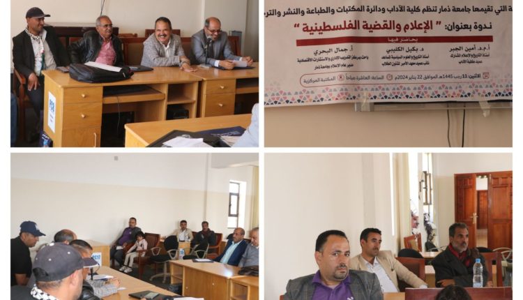 نظمت كلية الآداب ودائرة المكتبات والطباعة والنشر والترجمة بجامعة ذمار، اليوم، ندوة علمية إعلامية بعنوان”الإعلام والقضية الفلسطينية”.