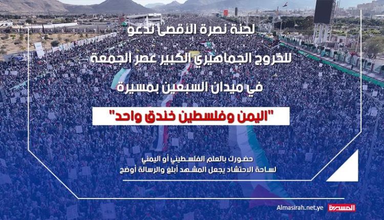 دعت لجنة نصرة الأقصى للخروج الجماهيري الكبير عصر الجمعة المقبل بميدان السبعين في مسيرة “اليمن وفلسطين خندق واحد”.