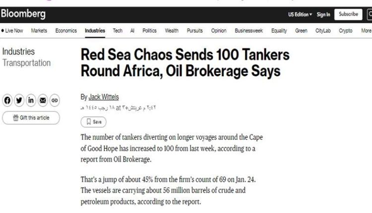 “بلومبرغ”: ناقلات النفط تتجه حول أفريقيا لتجنب المخاطر في البحر الأحمر