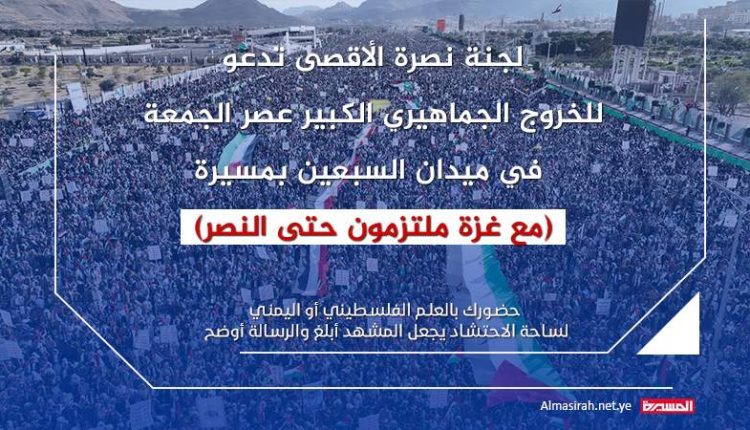 دعت لجنة نصرة الأقصى للخروج الجماهيري الكبير عصر الجمعة المقبل في ميدان السبعين بالعاصمة في مسيرة “مع غزة ملتزمون حتى النصر”
