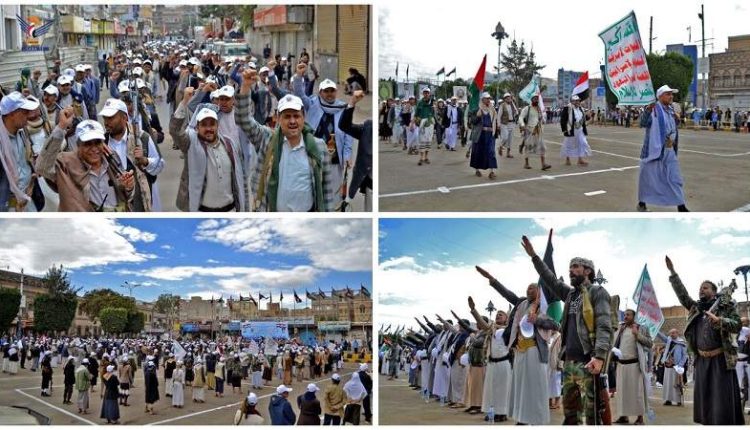 وانطلق المسير والعرض الشعبي من ساحة ملعب الظرافي مروراً بشارع علي عبد المغني وصولاً إلى ساحة ميدان التحرير ” حاملين معهم علم دولة فلسطين ومرددين الشعارات والهتافات المنددة بالعدوان الأمريكي والصهيوني الذي يرتكب أبشع الجرائم ومجازر الإبادة الجماعية بحق أبناء الشعب الفلسطيني الصامد في غزة.