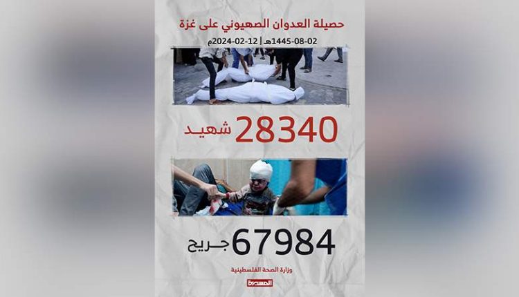 وأكدت ارتفاع حصيلة العدوان الصهيوني المتواصل على قطاع غزة منذ السابع من أكتوبر الفائت إلى 28340 شهيدا و 67984 جريحا.