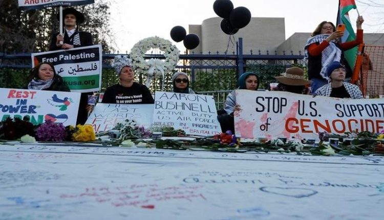 اعتصم العشرات أمام مقر السفارة الإسرائيلية في واشنطن في المكان الذي أشعل فيه الطيار الأمريكي، آرون بوشنل، النار في نفسه، احتجاجا على الحرب الدموية في قطاع غزة، مطالبين بوقف العدوان الإسرائيلي، وإدخال المزيد من المساعدات إليها.