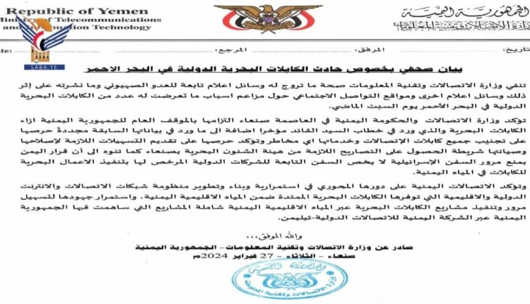 نفت وزارة الاتصالات وتقنية المعلومات، صحة ما تروج له وسائل إعلام تابعة للعدو الصهيوني وما نشرته على إثر ذلك وسائل إعلام أخرى ومواقع التواصل الاجتماعي، حول مزاعم أسباب ما تعرضت له عدد من الكابلات البحرية الدولية في البحر الأحمر يوم السبت الماضي.