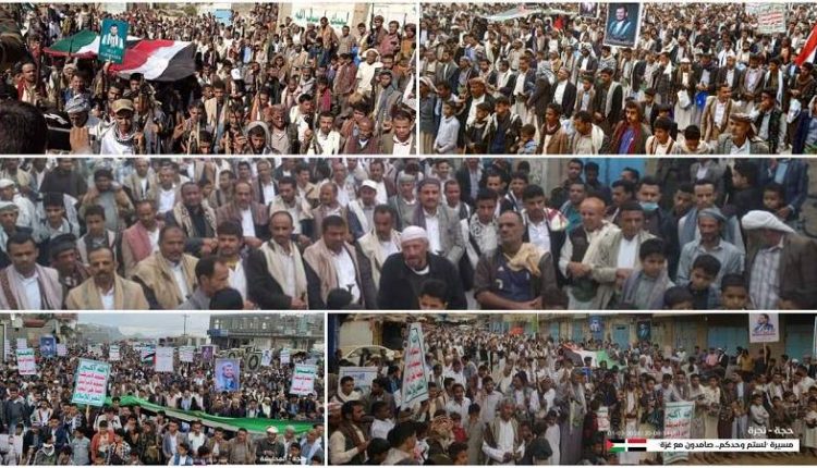 شهدت محافظة حجة اليوم الجمعة، مسيرات جماهيرية في 23 ساحة في مركز المحافظة والمديريات، تضامنا مع الشعب الفلسطيني وإسنادا لصمود غزة تحت شعار ” لستم وحدكم.. صامدون مع غزة”.