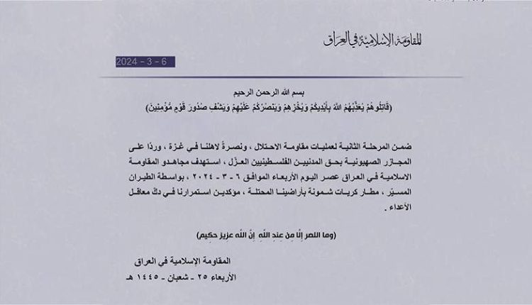 المقاومة العراقية تستهدف مطار “كريات شمونة شمال فلسطين المحتلة