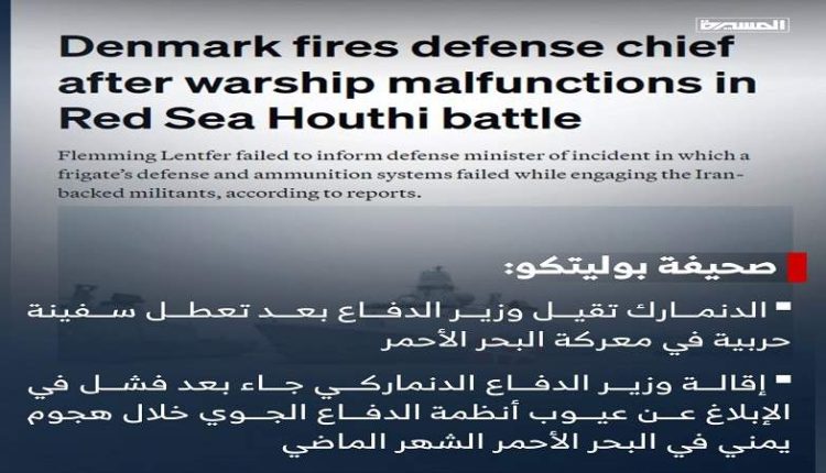 وقالت الصحيفة إن إقالة وزير الدفاع الدنماركي جاء بعد فشل في الإبلاغ عن عيوب أنظمة الدفاع الجوي خلال هجوم يمني في البحر الأحمر الشهر الماضي.