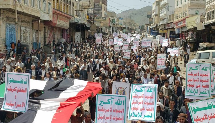 وخلال المسيرة التي تقدمها وكيل المحافظة هلال المقداد، ومدير المديرية ناجي صبر ومسؤول التعبئة العامة أحمد المعبري، ردّد المُشاركون الهتافات المُندّدة بالهمجية الصهيونية والأمريكية في إبادة الشعب الفلسطيني قتلاً وتهجيراً وتجويعاً .