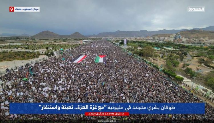 احتشاد مليوني متجدد بصنعاء نصرة لغزة تحت شعار (مع غزة العزة.. تعبئة واستنفار)