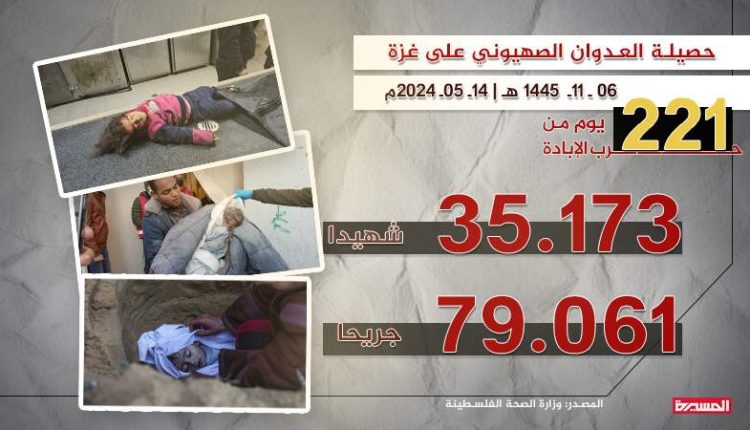 وقالت إن حصيلة العدوان الإسرائيلي على قطاع غزة قد ارتفعت إلى 35 ألفًا و173 شهيدًا، بالإضافة لـ 79 ألفًا و61 مصابًا؛ منذ الـ 7 من أكتوبر 2023 الماضي.