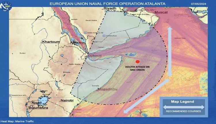 وقالت المذكرة إنه “تم استهداف السفينة (إم إس سي أوريون) بواسطة طائرة بدون طيار على بُعد 200 ميل بحريّ جنوب شرق جزيرة سقطرى، بينما كانت السفينة تمر في المحيط الهندي متجهة شمالًا نحو صلالة (عُمان)”.
