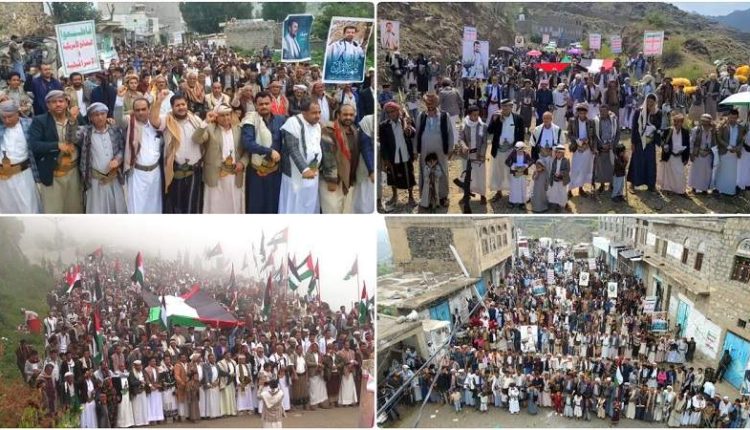 شهدت مديريات محافظة ريمة اليوم، مسيرات جماهيرية حاشدة في 23 ساحة استمراراً لنصرة الشعب والقضية الفلسطينية وتنديداً بمجازر العدو الصهيوني في قطاع غزة، تحت شعار “مع غزة جهاد مقدس ولا خطوط حمراء”.