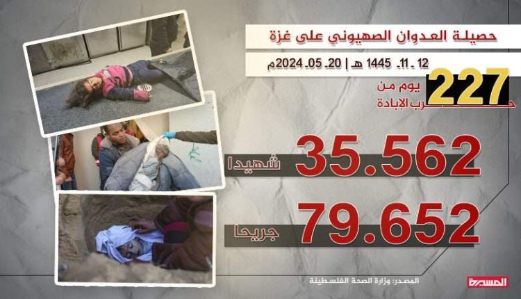 وأعلنت وزارة الصحة في التقرير الإحصائي اليومي لعدد الشهداء والجرحى جراء العدوان الإسرائيلي المستمر لليوم ال 227 تواليا، ارتفاع حصيلة العدوان إلى 35562 شهيدا و 79652 إصابة منذ السابع من أكتوبر الماضي.