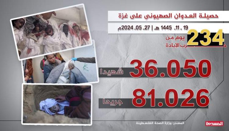 وفي التقرير الإحصائي اليومي لعدد الشهداء والجرحى جراء العدوان الاسرائيلي المستمر لليوم ال 234 على قطاع غزة، أفادت الوزارة بارتفاع حصيلة العدوان الصهيوني إلى 36050 شهيدا و 81026 مصابا منذ السابع من أكتوبر الماضي.