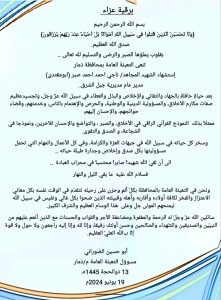 كما توجه مسؤول التعبئة العامة بالتعازي والمواساة لجميع الأخوة المجاهدين ولكل ابناء محافظة ذمار عامة ومديرية جبل الشرق خاصة .. سائلاً الله العلي القدير أن يتغمد الشهيد بواسع الرحمة والمغفرة ، وأن يسكنه فسيح جناته مع الذين أنعم عليهم من النبيّين والصديقين والشّهداء والصّالحين وحسن أولئك رفيقا .