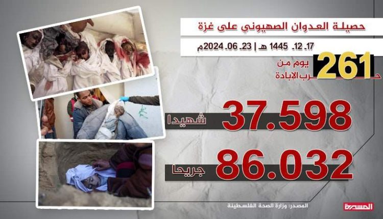 وأكدت الوزارة في تحديثها اليومي ارتفاع حصيلة العدوان إلى 37598 شهيدا و86032 إصابة منذ السابع من أكتوبر الماضي.