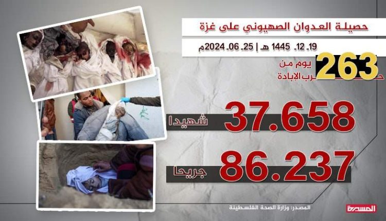 وأشارت الصحة الفلسطينية بغزة، في تقريرها اليومي لعدد الشهداء والجرحى جراء العدوان الصهيوني المستمر على القطاع منذ 263 يوما، إلى أن عددًا من الضحايا ما زالوا تحت الركام وفي الطرقات لا تستطيع طواقم الإسعاف والدفاع المدني الوصول إليهم.