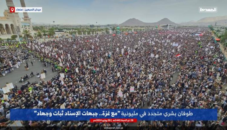 صنعاء تحتشد في طوفان مليوني جديد تضامنا مع فلسطين تحت شعار (مع غزة.. جبهات الإسناد ثبات وجهاد)