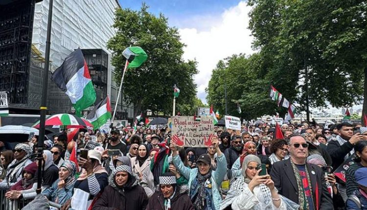 تظاهر عشرات آلاف المتضامنين مع فلسطين في العاصمة البريطانية لندن، مطالبين حكومتهم الجديدة بوقف بيع السلاح للكيان الصهيوني.