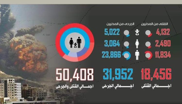 وأكد مركز عين الإنسانية سقوط 50,408 مدنيين بين شهيد وجريح، بينهم 18,456 شهيدا و31,952 جريحا.