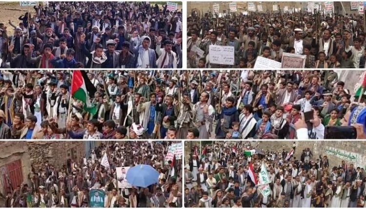 و توزعت المسيرات على ساحات ” الشهيد الصماد بالمدينة، خَمِر، بني صريم، صوير، خارف، حوث، الجبل، السُودة، المدان، مِرهبة ومركز ذِيبين، الهجَر والقابعي والهَيْجة بشهارة، بكيل السواد بسفيان، السُكيبَات والبَطنة والمخضارة بالقفلة، المغربة ومركز ثِلاء، ذو خيران، والسواد، مركز المديرية بالعشة، بني دهش وبني عيذ والجبر ومركز المديرية بظليمة، بني عبد بعيال سريح، العمشيّة، مركز المديرية بسفيان، قُطابة ومركز مديرية السَود، مفخاذ بالمدان، مكتب ذيفان ومكتب حمدة ومركز المديرية بريدة، الوادي والجدم وعيال مومر ومركز المديرية بمسوَر”، وذلك تضامناً ونصرة للشعب الفلسطيني تحت شعار “ثابتون مع غزة رغم أنف كل عميل”.