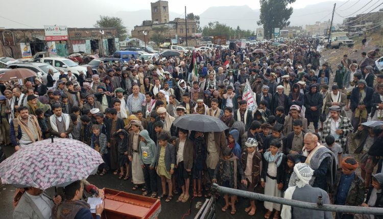مسيرة حاشدة بمديرية ضوران تحت شعار “انتصارا لغزة.. ماضون في المرحلة الخامسة من التصعيد”