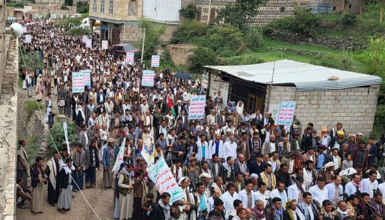 مسيرة حاشدة في مديرية عتمة بعنوان “انتصارا لغزة.. ماضون في المرحلة الخامسة من التصعيد”