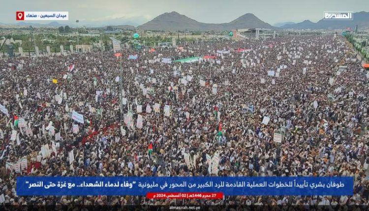 شهد ميدان السعبين أكبر ميادين العاصمة صنعاء، عصر اليوم الجمعة، مسيرة مليونية جديدة تحت شعار (وفاء لدماء الشهداء.. مع غزة حتى النصر)، في طوفان بشري متجدد نصرة وإسنادا للشعب الفلسطيني.