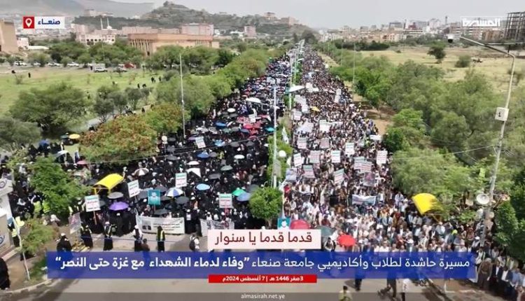 وخاطب بيان المسيرة شعوب الأمة العربية والإسلامية ” عار عليكم أن تشاهدوا أمريكا والغرب يحشدون بوارجهم في بحاركم وينصب حكامكم الدفاعات الجوية ليمنعوا عن إسرائيل صواريخ محور المقاومة المناصرة لنساء وأطفال غزة”.