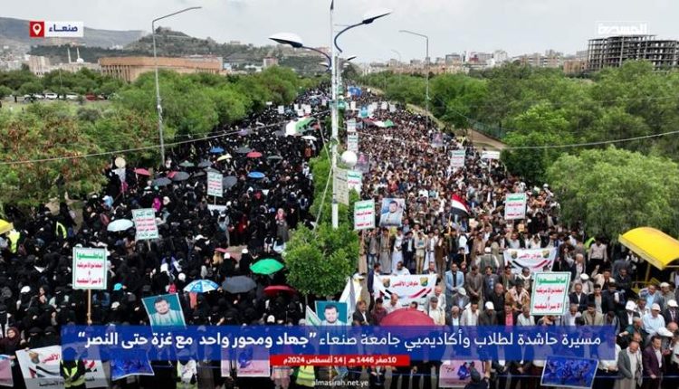 مسيرة مساندة لغزة في جامعة صنعاء بعنوان “جهاد ومحور واحد حتى النصر”