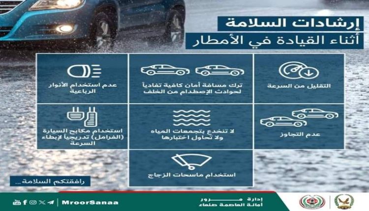 دعت شرطة مرور أمانة العاصمة كافة السائقين إلى ضرورة الالتزام بالتعليمات والإرشادات المرورية خلال هذه الفترة التي تشهد هطول أمطار غزيرة.