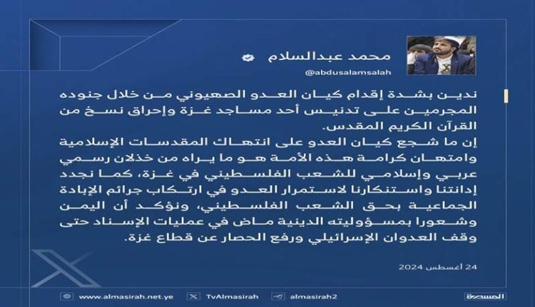 عبدالسلام يستنكر تدنيس كيان العدو لأحد المساجد بغزة و إحراق نسخ من القرآن الكريم