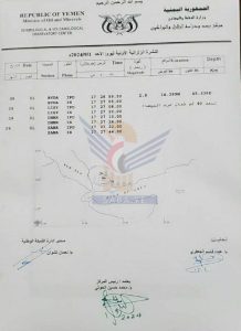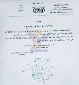 وحددت محطات الرصد التابعة للمركز الوطني لرصد ودراسات الزلازل والبراكين بذمار موقع البؤرة الزلزالية بين خطي طول وعرض (14.299ـ 45.336) على بعد 40 كلم من مركز محافظة البيضاء.