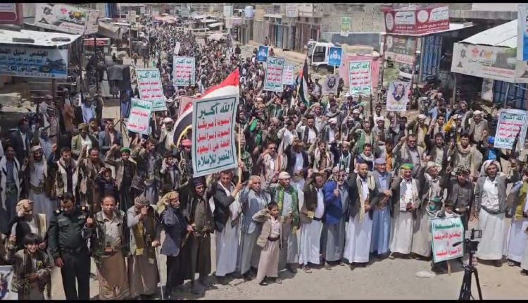 شهدت مديرية الحداء، اليوم، مسيرة جماهيرية حاشدة تنديداً باستمرار مجازر العدو الصهيوني في قطاع غزة بعنوان “مولد نبي الهدى دعوة لنصرة غزة والاقصى”.