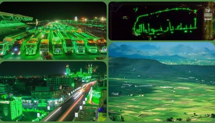 و تغمر الإضاءات الخضراء منازل وشوارع، وسيارات اليمنيين، طوال شهر الربيع المحمدي، حيث يعبر الشعب اليمني عن سعادته بقدوم هذه الذكرى والتي تعد من أقدس المناسبات بالنسبة لهم.