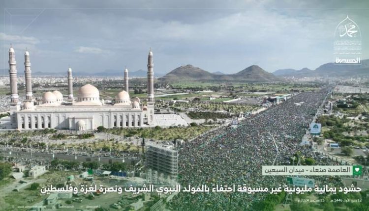 مسيرات مليونية هي الأضخم عالميا بصنعاء إحياء لذكرى المولد النبوي ونصرة لغزة