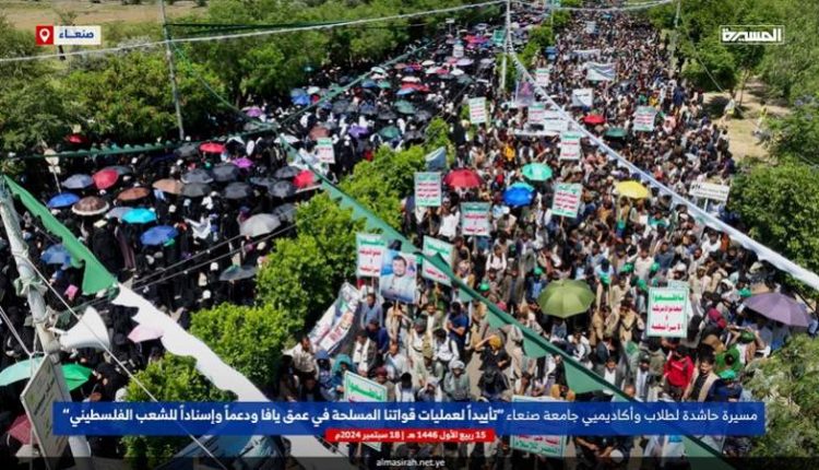 شهدت جامعة صنعاء اليوم الأربعاء، مسيرة طلابية وأكاديمية حاشدة ” تأييداً لعمليات القوات المسلحة اليمنية في عمق يافا ، ودعماً وإسناداً للشعب الفلسطيني ” وتنديداً واستنكاراً باستمرار مجازر الإبادة الجماعية بحق الشعب الفلسطيني بغزة .
