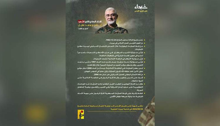 وزفّت المقاومة الإسلامية في لبنان – حزب الله، القائد الجهادي الكبير إبراهيم عقيل (الحاج عبد القادر)، “شهيداً على طريق القدس”، في إثر غارة إسرائيلية استهدفت الضاحية الجنوبية لبيروت، يوم الجمعة 20 سبتمبر الجاري.