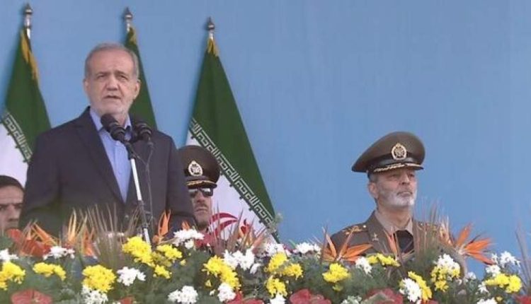 وخلال العرض العسكري للقوات المسلحة الإيراني، بمناسبة بدء أسبوع الدفاع المقدس، قال بزشكيان: لقد جاء العالم كله وحاول منع إيران من مواصلة ثورتها، لكن وجود الشعب وقوى الشعب والجيش البطل والحرس الثوري القوي منعهم من الاستيلاء حتى على شبر واحد من تراب إيران.