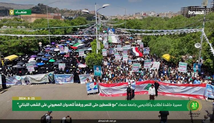 تظاهرة حاشدة بجامعة صنعاء تضامنا مع الشعبين الفلسطيني واللبناني