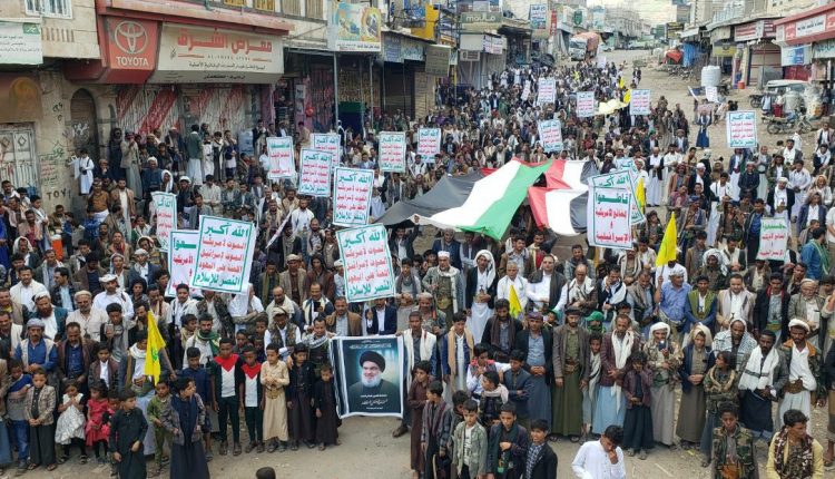 مسيرتان بمديرية جبل الشرق بذمار تحت شعار “وفاءً لشهيد المسلمين .. مع غزة ولبنان معركة واحدة حتى النصر