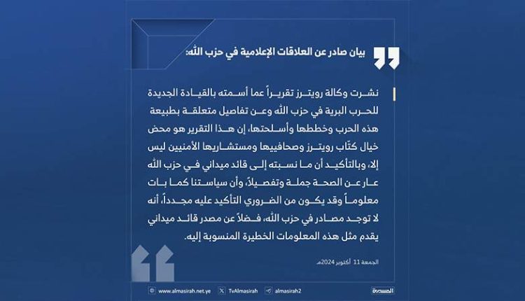 كذب حزب الله ما نشرته وكالة “رويتزر” البريطانية من أخبار حول ما أسمته بالقيادة الجديدة للحرب البرية في ‏حزب الله وعن تفاصيل متعلقة بطبيعة ‏هذه الحرب وخططها وأسلحتها.
