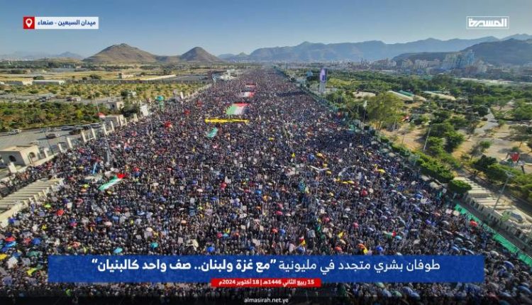 صنعاء تشهد مسيرات مليونية نصرة لفلسطين ولبنان تحت شعار (مع غزة ولبنان.. صف واحد كالبنيان)