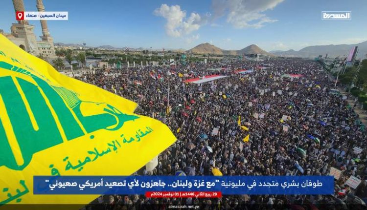 امتلاء ميدان السبعين، أكبر ميادين العاصمة صنعاء، اليوم الجمعة، بطوفان بشري مليوني متجدد إسناد غزة ولبنان تحت شعار “مع غزة ولبنان.. جاهزون لأي تصعيد أمريكي صهيوني”.