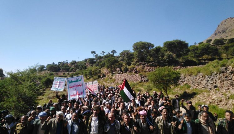 أحتشد أبناء مديرية مغرب عنس محافظة ذمار صباح اليوم في مسيرة جماهيرية بعنوان “مع غزة ولبنان.. على درب الشهداء حتى النصر”