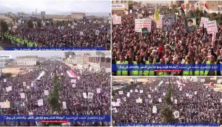 خرج أحرار محافظة عمران اليوم الجمعة في 50 ساحة حاشدة، تضامناً مع الشعب الفلسطيني ومساندة للمجاهدين، وذلك تحت شعار “مباركة للبنان مع غزة حتى النصر.. والاحتلال إلى زوال”.