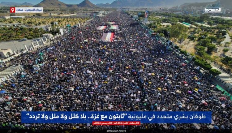 للأسبوع الـ60 على التوالي.. العاصمة صنعاء تفيض بطوفان مليوني نصرة لغزة تحت شعار “ثابتون مع غزة بلا كلل ولا ملل ولا تردد”