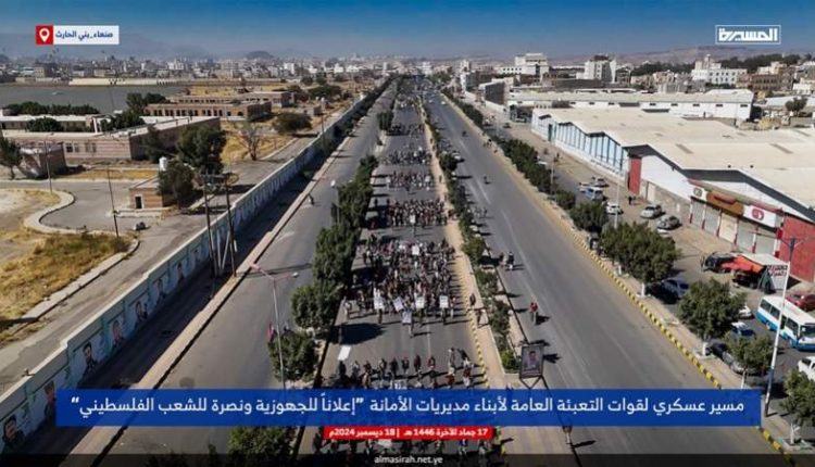 مسير عسكري لقوات التعبئة العامة بأمانة العاصمة لإعلان النفير العام والاستعداد لمواجهة أي تصعيد